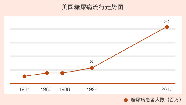 自20世纪70年代制糖业成功为自己“正名”后,美国在全世界范围内掀起了“高碳水、低脂肪”饮食的高潮,同时根据FDA法案,糖类的添加开始不受限制。自此,美国国民的肥胖、糖尿病发病率开始呈爆发式增长。